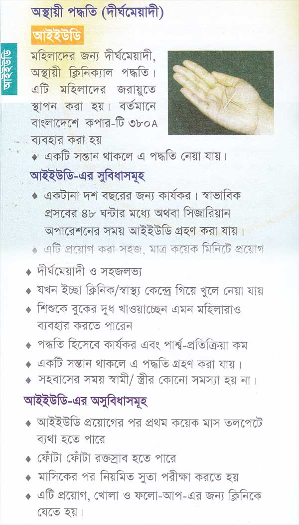 আইইউডি মহিলাদের জরায়ুতে স্থাপন উপযোগী একটি দীর্ঘ মেয়াদী অস্থায়ী জন্মনিয়ন্ত্রণ পদ্ধতি বাংলাদেশে সরকারী কার্যক্রমে ব্যবহৃত আইইউডি’র নাম কপার-টি ৩৮০-এ। সঠিক নিয়মে ব্যবহার করলে এটি অত্যন্ত কার্যকর (৯৯.৯৯%)।